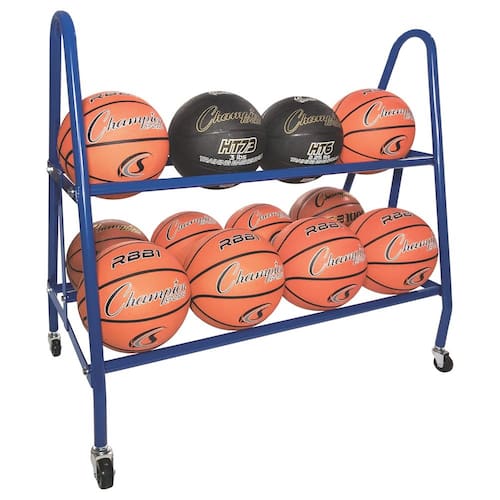 Carrinho de armazenamento para basquete Champion Sports com duas camadas e rodas giratórias, capacidade para 12 bolas (azul).