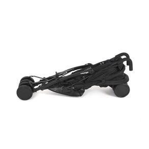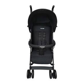 Carrinho de bebê compacto, leve e sofisticado com múltiplas posições de inclinação, ampla capota com visor, apoio ajustável para os pés e alça para transporte.