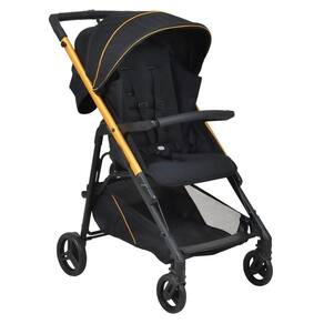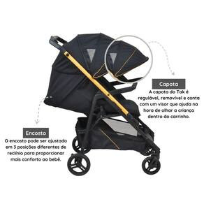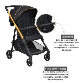 Características Técnicas: Cor predominante: metal gold Chassi em alumínio Design super moderno Leve e prático quando em uso, pode ser guiado com uma mão Capota extensível, regulável e com visor Cinto de segurança de 5 pontos com ajuste de altura nos ombros Protetor frontal removível e com sistema de abertura/fechamento automático não há a necessidade de retirar para abrir ou fechar o carrinho Protetor frontal regulável e acolchoado com prolongador, facilitando para acomodar e retirar a criança do carrinho Rodas dianteiras com giratórios Rodas com rolamento, proporciona ótima dirigibilidade e fácil condução Freio traseiro conjugado Cesto porta-objetos Encosto reclinável em 3 posições Fácil de fechar, compacto quando fechado Fica em pé quando fechado Transforma-se em TRAVEL SYSTEM com a utilização da cadeira Touring X sistema nana-nenê VENDIDO SEPARADAMENTE