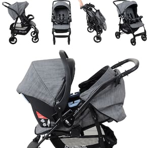 O carrinho tem cinto de 5 pontos, protetor frontal removível e freio manual na manopla. As rodas dianteiras giratórias com travas oferecem estabilidade e o cesto inferior acomoda bolsas e brinquedos. O ninho Pramette proporciona acolhimento desde o nascimento, enquanto o bebê conforto Materna, acoplado à base Belted, garante viagens firmes e tranquilas para o bebê e mais praticidade aos pais.
