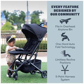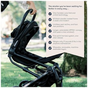 Possui assento reclinável em múltiplas posições sem limite, com liberação fácil e rápida, e capota prolongada com proteção solar UPF 50+ para bloqueio eficiente dos raios solares. O encosto e apoio para pernas são ajustáveis para proporcionar conforto personalizado ao bebê e ao toddler.