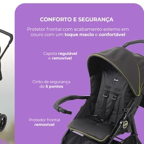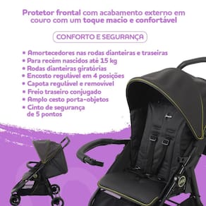 Protetor frontal com acabamento em couro sintético: removível, com toque macio e confortável para o bebê.