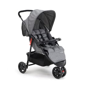Para os pais, tem manopla inteiriça acolchoada, capota retrátil com visor, amplo cesto de conveniência com capacidade para 5 kg e bolso na capota. Trava de giro na roda dianteira e freio único nas traseiras.