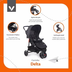 O Carrinho de Bebê Delta da Voyage é um carrinho de três rodas, moderno, com barra frontal removível e um confortável colchonete acolchoado, removível e lavável, para acomodar crianças dos 0 ao 15 kg. Possui cinto de segurança de 5 pontos, com altura regulável. A inclinação do encosto pode ser ajustada para a posição mais deitada e a altura do apoio de pés, até a posição mais fechada.Para os pais, tem manopla inteiriça acolchoada, capota retrátil com visor, amplo cesto de conveniência com capacidade para 5 kg e bolso na capota. Trava de giro na roda dianteira e freio único nas traseiras.Aprovado pelo INMETRO conforme a norma ABNT NBR 14.389 para crianças do nascimento aos 15kg.CARACTERÍSTICAS Colchonete acolchoado removível e lavável Inclinação total do encosto, tipo berço Manopla inteiriça acolchoada Capota retrátil e com visor Apoio ajustável de pés Barra frontal removível Cinto de segurança de 5 pontos com ajuste de altura Bolso na capota Amplo cesto de conveniência Aprovado pelo INMETRO