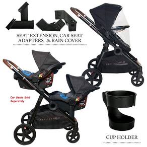 POSIÇÕES DO ASSENTO o assento do carro e o assento da criança podem ser s na frente ou na traseira. Feito com um tecido de proteção ultra UV e não tóxico. A caixa inclui todos os adaptadores necessários para conectar um assento de carro ou assento de criança nas posições frontal e traseira na estrutura do carrinho. Por favor, veja o vídeo em imagens para obter recursos adicionais.