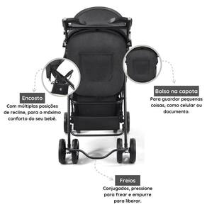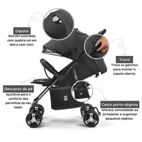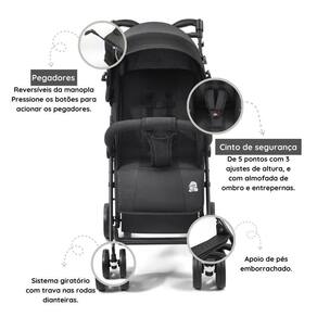 Características técnicas: Cor predominante: preto Para crianças recém-nascidas até 15 kg Composição do material: estrutura - aço partes plásticas - ppr8003 tecido - poliéster rodas - eva Cinto de segurança de 5 pontos com protetor de ombros e entrepernas Barra frontal removível Capota retrátil e estendida Quebra sol em tecido de tela Apoio de pés ajustável Bolso na capota Cesto amplo Freio conjugado Múltiplas posições de recline de encosto Totalmente reclinado para soneca ou vertical para passeio Visor em tecido de tela na capota Pegadores reversíveis na manopla: 8 posições Rodas dianteiras com sistema giratório e trava 4 rodas duplas de 17 cm para amortecimento e estabilidade Inmetro: 008510/2021