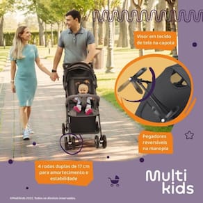 Características Principais: Encosto Reclinável: Ajusta-se em múltiplas posições, incluindo a posição berço para uma soneca confortável ou posição vertical para passeios. Apoio de Pés Ajustável: Maior conforto em todas as fases do crescimento do bebê. Manopla com Pegadores Reversíveis: Adapta-se à direção desejada para facilitar a condução. Capota Retrátil e Estendida: Protege contra sol e chuva, com viseira em tecido de tela e quebra-sol. Barra Frontal Removível: Facilita colocar e retirar o bebê do carrinho. Rodas Duplas de 17 cm: Oferecem estabilidade e melhorias até mesmo em terrenos irregulares, com sistema giratório e trava nas rodas dianteiras. Cesto Amplo: Perfeito para levar itens essenciais nos passeios. Praticidade: Fechamento simples e rápido, ideal para pais que estão sempre em movimento. Segurança: Cinto de 5 pontos ajustáveis em largura e altura, com protetores de ombro e entrepernas. Travel System Compatível: Acopla bebês conforto Rest BB406 e BB407 (vendidos separadamente) para maior praticidade.