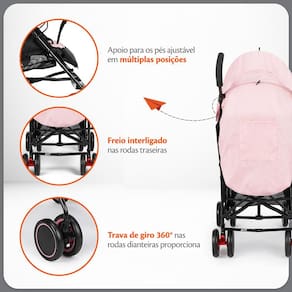 Características: Fechamento compacto e rápido: Fechamento estilo guarda-chuva, leve e fácil de transportar, com alça para levar a qualquer lugar. Assento reclinável: Três posições de inclinação, incluindo o modo berço, ajustáveis com uma mão. Capota ampla e extensível: Com visor, aba de sol e bolso porta-objetos, protege o bebê do sol e do vento. Apoio de pés ajustável: Possui cinco ajustes de altura, ideal para acompanhar o crescimento do bebê. Rodas duplas com travas: Estabilidade e controle total, com trava de giro 360 nas rodas dianteiras e freio interligado nas traseiras. Cinto de segurança de 5 pontos: Ajustável em altura e largura, com protetores acolchoados para máxima segurança. Cesto porta-objetos: Capacidade para até 3 kg, perfeito para carregar itens essenciais.
