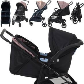 O modelo possui encosto reclinável em quatro posições, capota regulável e removível, cinto de segurança de cinco pontos, protetor frontal removível, rodas dianteiras giratórias, freio traseiro conjugado e cesto porta-objetos.