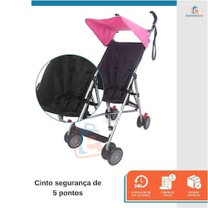 - Capota protege do sol; - Espaço para acessórios; - Freios traseiros; - Cinto segurança de 5 pontos; - Fechamento ultra fácil; - Tecido lavável.