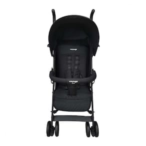 Carrinho de bebê compacto, leve e só esticado com múltiplas posições de inclinação, ampla capota com visor, apoio ajustável para os pés e alça para transporte. O carrinho Park Voyage possui assento ajustável em múltiplas posições de forma fácil quando totalmente deitado para o uso desde o nascimento, o que garante maior conforto para a criança na hora do passeio. Com rodas duplas e freio interligado nas rodas traseiras e trava de movimento nas rodas dianteiras, capota extensível com visor que permite maior proteção em dias ensolarados, barra frontal, proteção entrepernas e cinto de segurança de 5 pontos. Estrutura leve e fechamento compacto tipo guarda-chuva facilitam o transporte do carrinho.