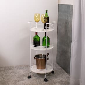 Carrinho de bebidas decorativo redondo móvel com rodinhas multifuncional com estilo industrial e retro com lateral em aço e prateleiras de madeira em MDP para sala de estar, sala de jantar, bares e adegas Acabamento da Prateleira: Melamínico Acabamento dos Pés: Polipropileno Altura dos Pés: 4 cm Ambiente Principal: Sala de Jantar Bandeja: Não Possui Complexidade da Montagem: Baixa: pode ser montado por uma pessoa sozinha Cor: Branco Fosco Cor do Produto: Branco Fosco Escala de Brilho: Fosco Escala de Brilho da Prateleira: Semi-Brilho Itens Inclusos: 1 Carrinho e manual de montagem Manual de Montagem e Instalação: https://cdn2.madeiramadeira.com.br/prd/metaltru-ltda/2058754-23511%20-%20manual%20de%20montagem.pdf Material da Prateleira: MDP Material dos Pés: Polipropileno Material Principal: Aço Necessita Montagem: Sim Origem do Produto: Nacional Pés Reguláveis: Não Peso: 6,24 kg Peso Máximo por Prateleira: 5 kg Porta Rolhas/Tampinhas: Não Porta Taças: Não Porta-garrafas: Não Possui Adega: Não Possui Espelho: Não Possui Gavetas: Não Possui iluminação: Não Possui Pés: 04 Possui Portas: Não Possui Prateleiras: 03 Possui Rodízio: Sim Possui Vidro: Não Recomendações de Uso, Manutenção e Limpeza: Limpar com pano umedecido Rodízio com Trava: Não Sapatas Niveladoras: Não Sistema de Montagem: Parafuso cabeça panela phillips Suporta Até (kg): 10 kg