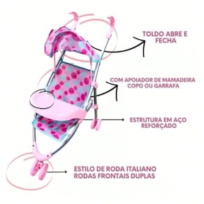 Carrinho para boneca para dar passeios super divertidos! Ele é no modelo 3 rodas, tem uma estampa linda e é dobrável, facilitando o transporte para qualquer lugar.