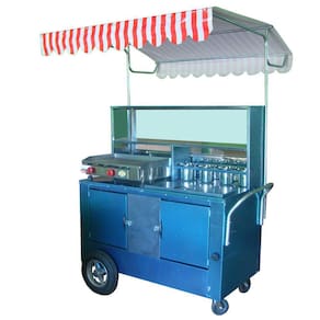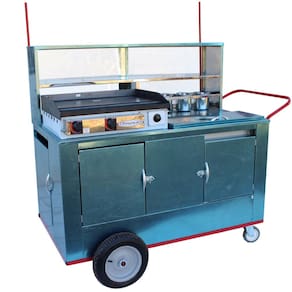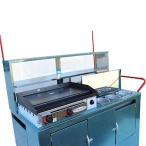 Gabinete em chapa galvanizada e aço inox externo 4 cubas de 12 cm para molhos 2 cubas de cozimento fogo direto 1 fogão de baixa pressão Mesa superior em aço inoxidável Chassi super reforçado em tubo metalão de 25x25 mm 2 Rodas pneumática 325 x 8 com rolamento. Gabinete interno para utensílios 2 Rodízios de 5 polegadas Compartimento para acondicionar os pães