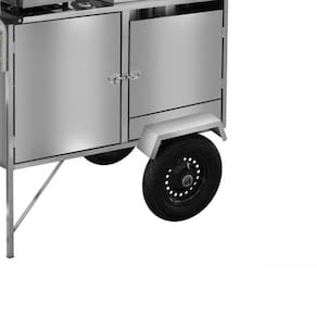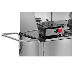 Além disso, essa carrocinha de cachorro quente conta com um empurrador e rodas pneumáticas para facilitar o seu deslocamento durante o trabalho.