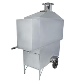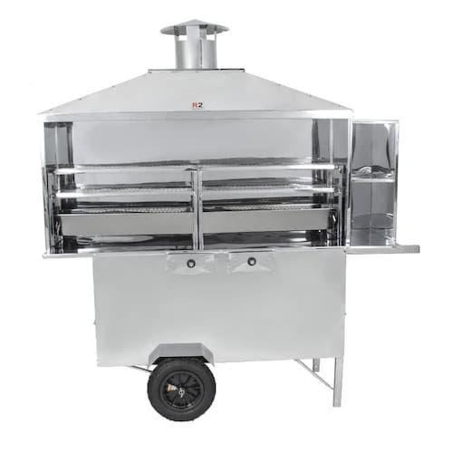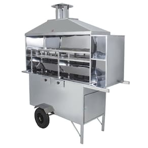 O Carrinho de Churrasco conta com churrasqueira a carvão inteira em aço inox sendo a Churrasqueira do modelo grande com 1,60m possuindo duas grelhas com apoio. Para uma maior maciez durante o transporte, suas duas rodas são com câmara além de Baú com duas portas para guardar os mantimentos de trabalho e duas gavetas para guardar dinheiro que também servem para outras utilidades. A Churrasqueira desse carrinho é a carvão e possui duas grelhas com apoio para uma terceira.