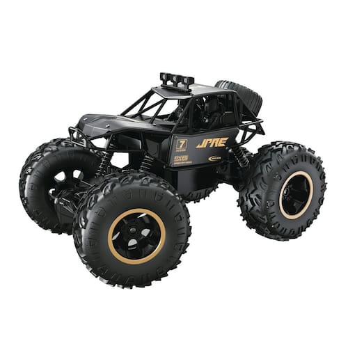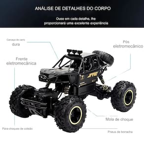 Ele opera em uma frequência de 40MHz e possui grandes pneus com tração nas quatro rodas, além de uma suspensão com molas que absorve impactos, proporcionando uma performance suave e estável. As funções de controle incluem avançar, recuar, virar à esquerda e à direita, permitindo total controle sobre o veículo.