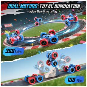Carrinho de controle remoto Hamdol Red & Blue, desenvolvido para crianças a partir de 6 anos, com carroceria em plástico ABS resistente a impactos e design dupla face em vermelho e azul que permite condução em ambos os lados após capotagens. A tração 4WD e o sistema de rotação possibilitam giros de 360°, flips e manobras contínuas em ambientes internos e externos planos, contribuindo para o desenvolvimento de coordenação motora e percepção espacial.??