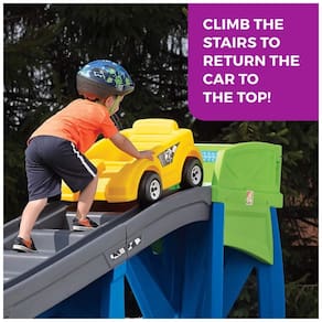 O design vibrante e colorido atrai a atenção e garante que os pequenos caçadores de emoções experimentem a sensação do vento no rosto enquanto descem repetidamente pela pista. Subir os degraus grandes é fácil e seguro, além de estimular a coordenação e o equilíbrio, e os poços rebaixados garantem que o carrinho se mantenha estável até que a criança esteja pronta para começar o passeio.