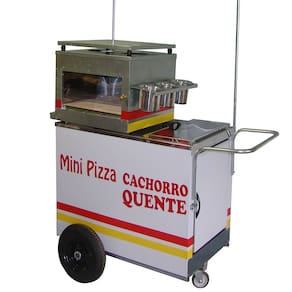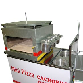 Descrição do Produto Modelo :4260 Gabinete em chapa Com Pintura Epóxi Mesa superior em aço inoxidável. 2 Rodas pneumática 325 x 8, com rolamento. 1 Roda giratória de 4 polegadas 1 Forno Mini Pizza Baixa Pressão Adesivo nas cores vermelho e amarelo