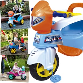 O Baby City acompanha o crescimento do seu bebê, os primeiros passeios são com o empurrador, e, para a segunda versão, é só retirar o aro protetor, o apoio de pé e o empurrador para que os pequenos possam se divertir pedalando. Ele tem roda com borracha antiderrapante.