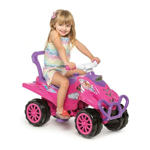 Aventuras, passeio e pedal, ficam mais divertidos com o Carrinho de Passeio ou Pedal Cross Turbo Calesita, um carrinho seguro e divertido para passeios. Confortável e grande, é o companheiro ideal para a aventura dos pequenos. Os acessórios de passeio são móveis, podendo retira-los, assim libera o volante e a criança pode pedalar desenvolvendo a coordenação dos movimentos. Disponível com buzina e assento reclinável para guardar brinquedos e suas rodas são com borracha para evitar derrapar. Indicado para o peso de até 45 kg e passeio a partir de 01 ano, pedal 02 anos. Características Técnicas: Controle de direção: Guiada pelo adulto com facilidade e segurança para manobrar; Encaixe e desencaixe o aro com praticidade; Encaixe e desencaixe o empurrador com praticidade; Mais facilidade para pedalar; Tração por correia; Com buzina; Com aro protetor; Com apoio de pés; Espaço para guardar brinquedos; Rodas com borracha para não derrapar; Idade Recomendada: A partir de 12 meses; Certificação de Segurança do INMETRO; Suporta até 45 Kg; Cor: Pink