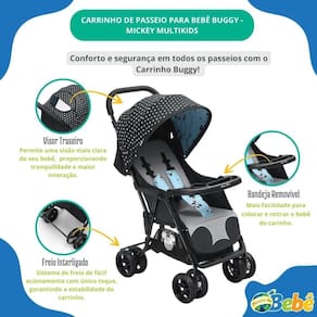 Carrinho de passeio para bebê tipo berço buggy mickey multikids O carrinho de bebê buggy foi pensado para os pais que buscam praticidade, sem abrir mão de conforto e segurança no dia a dia. Com um design moderno e funcional, ele traz tudo o que você precisa para tornar os passeios com seu pequeno ainda mais especiais. Super estiloso e prático, ele possui estrutura leve e resistente, com um sistema de fechamento envelope simples, que o deixa super compacto e fácil de transportar ou armazenar quando não estiver em uso. A capota retrátil, composta por 3 seções, possui camada dupla estampada, oferecendo proteção eficaz contra o sol e a chuva. Ela também possui visor, que permite uma visão clara e privilegiada do bebê, além de assegurar o conforto em qualquer clima. Já o apoio de pés é ajustável em 2 alturas, e a bandeja com porta-copos é removível, facilitando o processo de colocar e retirar o bebê do carrinho, tornando-o ainda mais funcional. Além disso, as 4 rodas são duplas, em eva de 14 cm de diâmetro, para garantir maior estabilidade. As dianteiras são giratórias com trava, e as traseiras equipadas com freio conjugado para maior segurança. Acompanha par de adaptadores para travel system compatível com o bebê conforto disney baby bb420 vendido separadamente , para uma transição perfeita do carrinho para o carro, sem perturbar o soninho do bebê. Principais características: - idade recomendada: do nascimento até 15kgs - peso máximo suportado: 15kgs - modelo: buggy mickey - design estiloso disney - ideal para passeios diários e viagens - garante praticidade, segurança e conforto - cinto de segurança de 5 pontos com ajuste de altura e largura - encosto reclinável em múltiplas posições - assento largo e confortável com 34cm de largura - reclina até a posição berço - reclina até a posição vertical - fechamento simples envelope - bandeja com porta-copos removível - capota retrátil com 3 seções - apoio de pés ajustáveis em 2 alturas - cesto porta objetos amplo - estrutura leve e resistente - fácil armazenamento e transporte - acompanha par de adaptadores para bebê conforto - compatível com bebê conforto bb420 vendido separadamente - aprovado pelo inmetro Especificações técnicas: - conteúdo da embalagem: 1 carrinho de passeio buggy multikids + par de adaptadores + manual de instruções. - dimensões do produto aberto axlxp : 48,0 x 58,0 x 97,0 cm - dimensões do produto fechado axlxp : 90,0 x 48,0 x 29,0 cm - composição/material: aço, eva, polipropileno, poliéster, pa e pom - peso: 5,100kgs - : 6 meses contra defeitos de fabricação pelo fabricante - certificação: inmetro 10689/2024-cac-1 abnt nbr 14389:2010 - código do fabricante: bb495 - ean: 7908842808842 - marca: multikids Imagens meramente ilustrativas. As cores e estampas podem variar de acordo com o lote do fabricante. Homologação Inmetro: CE-BRI/IQB 002295 54761/21-023