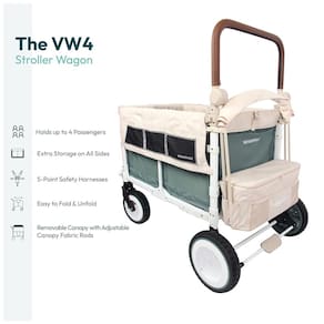 Carrinho de Passeio para 4 Crianças Multifuncional com Faróis Funcionais e Rodas Retrô, até 136 kg, WONDERFOLD Volkswagen, Verde