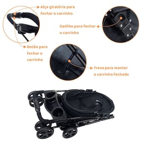 Especificações: * Acompanha manual de instrução; * Dimensões do produto aberto (altura x largura x comprimento): 96 x 45 x 68 cm; * Dimensões do produto fechado (altura x largura x comprimento): 23 x 45 x 84 cm; * Dimensões do berço (altura x largura x comprimento): 47 x 32 x 54 cm; * Quatro rodas frontais de 5,5" com pneus EVA; * Quatro rodas traseiras de 5,5" com pneus EVA; * Peso do carrinho é de 4,9 kg; * Para pets até 15 Kg; * Ideal para cachorros e gatos; * Modelo Pet foi um Lulu da Pomerânia de 9 kg.