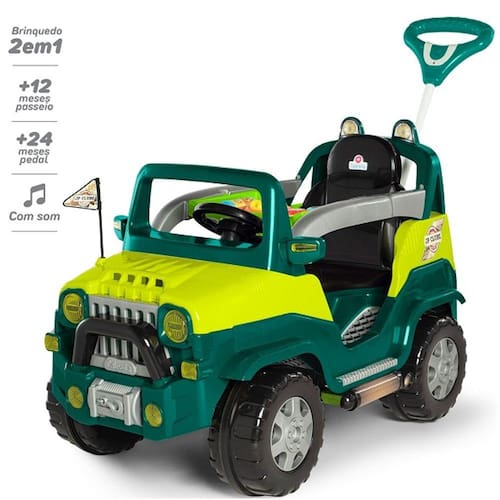 O Diipi tem borracha antiderrapante nas quadro rodas, buzina, bandeira de JP Clube e cinto de segurança como num Jipe de verdade.