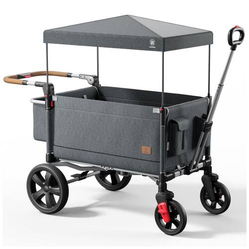 O carrinho é projetado com a segurança das crianças em mente, apresentando um cinto de segurança de 5 pontos integrado e dois assentos face a face, suportando até 49 kg (24 kg por assento). Os freios de pé em cada roda oferecem controle total de rotação de 360° e movimento linear, enquanto a capota UPF 50+ protege a pele sensível dos raios nocivos do sol.