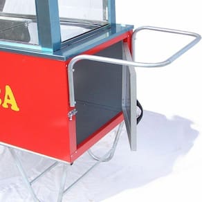 O carrinho possui um compartimento interno projetado para acondicionar o botijão de gás e utensílios diversos, mantendo a organização e praticidade. Além disso, vidro possui divisões para pipocas doces e salgadas, com abertura superior para fácil acesso.