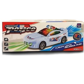 As crianças podem ver o carro de polícia se mover para frente, para trás e girar 360 graus em qualquer superfície plana. Se bater na parede ou em um objeto, ele muda automaticamente sua direção.