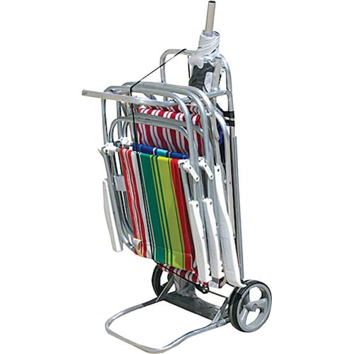Leve, prático e com rodas grandes, o carrinho mesa é Ideal para transporte de cadeiras de praia, guarda-sol, esteiras e outros objetos.