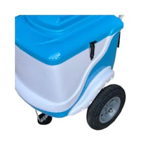 O carrinho é construído com caixas internas e externas de poliestireno, isolamento de poliuretano e tratamento antiferrugem, garantindo maior durabilidade. Ele conta com rodas de nylon com pneus de câmara de ar, facilitando o deslocamento, e um suporte para guarda-sol, que oferece proteção para o vendedor durante o uso.