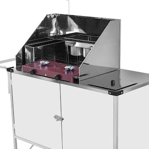 Esse Carrinho é fabricado com estrutura em aço carbono e chapa de aço pintada de branco, acompanha 3 canecas pequenas para qualquer tipo de recheio e fogão 2 bocas baixa pressão indo pronto para o uso. Além disso acompanha adesivo e guarda sol para dias chuvosos e ensolarados.