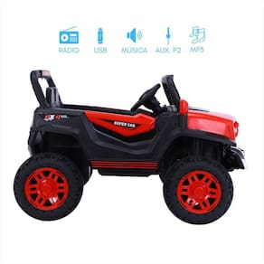 - Tem Ré Sim - Luz de Led no farol dianteiro Sim - Tem acionamento da buzina Sim - Tem Rádio Sim - Tem USB Sim - Tem entrada para Cabo Auxiliar P2 Sim - Tem Música Sim - As portas abrem Sim - Luz do Painel Sim - Voltímetro digital que marca o percentual de uso da bateria Sim - Botão para aumentar/diminuir o volume Sim - Botão de Liga/Desliga que emite ronco do motor Sim - Pedal para que a criança possa acelerar Sim
