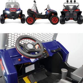O Quadriciclo Elétrico Polaris RZR 900 XP da Peg-Pérego está disponível apenas na cor azul, com detalhes em preto e vermelho.