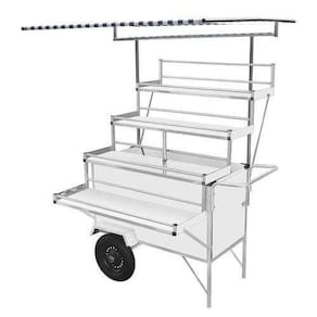 Ótima opção para quem quer empreender, o Carrinho Ambulante Expositor de Frutas com Roda Pneumáticas e Toldo, é um produto de excelente qualidade, de fácil manuseio e limpeza e muito prático.