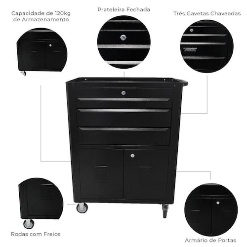 Carrinho de Ferramentas Fercar com 3 Gavetas Chaveado Preto - C-06O Carrinho de ferramentas da Fercar é ideal para quem busca um equipamento de qualidade para a organização de seus pertences.Especificações Técnicas:Modelo: C06Cor: PretoCapacidade: 120 kgAs duas primeiras gavetas possuem divisórias fixas1 gaveta 50 cm x 36 cm x 60 cm2 gavetas 50 cm x 36 cm x 10 cmDescrição do Produto:3 gavetas chaveadas, sendo 2 com divisorias fixas + 1 armário de portasCom freio para utilização em lugares inclinadoPintura eletrostáticaPrateleira fechadaConteúdo da embalagem:01 chave reserva04 rodas sendo: 2 fixos e 2 giratórios 1 com freio 01 alça para transporteGarantia: 06 meses pelo fabricante.Pesquisas relacionadas: carrinho de ferramentas, carrinho ferramentas, carrinho para ferramentas, carrinho de ferramenta, fercar, carrinho de ferramenta fercar, carrinho de ferramenta fercar com gaveta.