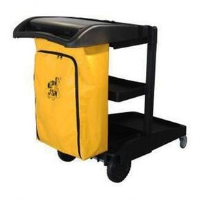 Super resistente, é fabricado em pp (polipropileno). O saco em lona que fica na parte traseira possui abertura através de zíper, onde pode ser acomodado sacos de lixo, luvas, panos e produtos para higiene e limpeza. Também possui prateleiras para que seja colocado os acessórios como placa de sinalização de limpeza, pá e mops entre outros.