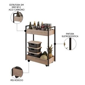 Características do Produto Material da estrutura: MDP BP/Aço Carbono. Acabamento: Melamina BP. Escala de Brilho: Fosco. Peso Suportado: 25 kg distribuídos. Quantidade de Prateleiras: 2 Prateleiras Caixa. Tipo dos Pés: Rodízios. Diferenciais: - Design moderno, estilo industrial. - Carrinho multiuso para diversos ambientes. - Rodízios para melhor mobilidade e versatilidade. - Estrutura de aço carbono 20x20 com pintura eletroestática. Sistema de Montagem: Parafusos. Manual de Montagem: Sim. Complexidade da Montagem: Baixa. Volumes: 1 Volume. Conteúdo da Embalagem: 1 Carrinho Gourmet. Garantia do Fabricante: 90 dias contra defeito de fabricação. Montagem: Recomendamos que seja feita por um profissional. Recomendação de Limpeza: Utilize pano levemente úmido.