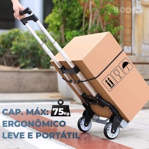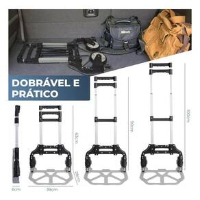 Compacto e Resistente: Construído em alumínio resistente, este carrinho é leve, pesando apenas 3,2 kg, e ainda assim robusto o suficiente para suportar cargas de até 75kg. Sua estrutura proporciona estabilidade e segurança, garantindo uma plataforma sólida para acomodar diversos itens.