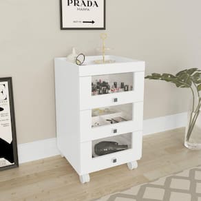 Carrinho para Organizar Maquiagem, PE2013, produto exclusivo tecno mobili, é indicado para organizar as maquiagens, batons, acessórios e demais produtos de beleza, por possuir na parte interna das gavetas divisores setorizadores para organizar seus mais diversos produtos de beleza. Possui quatro rodízios para melhor mobilidade podendo ser movido para qualquer direção com facilidade. Produzido em mdp 15mm e acabamento em bp, possui vidro na frente das gavetas para que você possa enxergar tudo o que tem, além da bandeja fixa no topo da peça que deixa tudo mais a mão. É totalmente fabricada no brasil e além de seu bonito visual é feito com madeira de reflorestamento, sendo 100 ecologicamente correta, o que confere a boa resistência e durabilidade à peça não agredindo o meio ambiente.