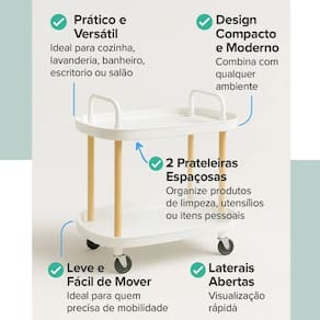 Carrinho Organizador Multiuso 2 Prateleiras Carrinho Organizador Multiuso 2 prateleiras Uma opção prática e versátil para quem precisa de funcionalidade no dia a dia. Com estrutura resistente e design compacto, ele é ideal para manter itens organizados e sempre à mão em diversos ambientes, como cozinha, lavanderia, banheiro, escritório ou salão de beleza. Suas duas prateleiras espaçosas permitem armazenar desde produtos de limpeza até utensílios, materiais de trabalho ou itens pessoais. Seu formato leve facilita o , sendo perfeito para quem precisa de mobilidade e organização em um só produto. As laterais abertas proporcionam fácil visualização e acesso rápido aos objetos, enquanto o design moderno se adapta facilmente a diferentes estilos de decoração. É uma excelente escolha para otimizar espaços e manter tudo no lugar com praticidade e eficiência.
