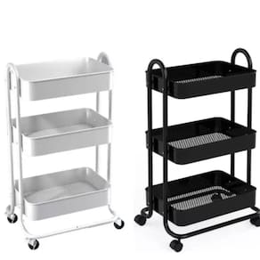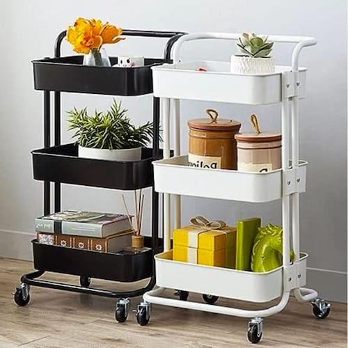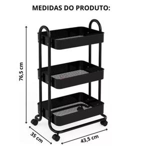 Cores Disponíveis: - Preto e Branco- Caracteristicas: - Material: Aço Inox e Plástico - Bandeja em Plástico - Hastes em Aço inox - Acompanha 4 Rodinhas - 3 Divisórias - Peso suportado por prateleira: 16,5kg Dimensões: Altura Total: 86cm Altura Entre as Bandejas: 30cm Comprimento Bandeja: 38cm Lagura Bandeja: 29cm Altura Bandeja: 7cm Itens inclusos: 1 Carrinho Organizador Multiuso ( Desmontado ) 1 Chave Philips 1 Manual de Instruções