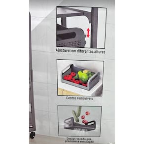 Organização Personalizada: Ajuste os cestos conforme sua necessidade para uma organização eficiente. Mobilidade e Praticidade: Facilmente movível, ideal para reorganizar os espaços e facilitar o acesso aos itens armazenados. Multiuso: Perfeito para uso em qualquer ambiente da casa, como cozinha para utensílios e alimentos, banheiro para produtos de higiene, escritório para materiais de trabalho ou lavanderia para produtos de limpeza. Fácil de Montar: Montagem simples e rápida, com instruções claras e intuitivas. Especificações Técnicas: