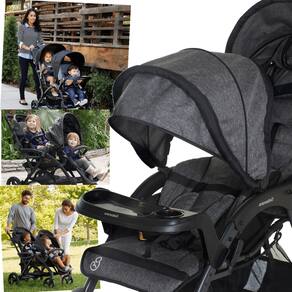 Doppio II possui sistema de fechamento com apenas uma mão, encosto regulável com 3 posições de reclinação, bandeja removível, rodas removíveis, sistema único de freio, amplo cesto porta objetos, capotas retráteis, visor na capota traseira e trava de fechamento.
