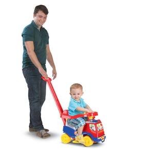 Possui apoio para os braços e pezinhos, e uma haste para empurrar permite que o adulto passeie com a criança de forma confortável e segura