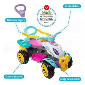 Benefícios do Produto: O Quadriciclo Menina Maral acompanha as diferentes fases de desenvolvimento da criança, proporcionando entretenimento e aprendizado. Seu design moderno e resistente, aliado à tecnologia internacional de alta qualidade, garante segurança e durabilidade.